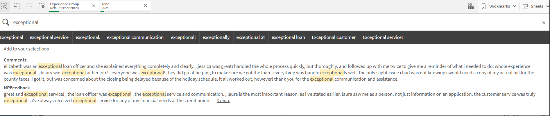 Aside from searching by member or employee-centric information, you can search for words, phrases, or terms such as this example below as we are looking for any mention of the word "exceptional". Perhaps we are hoping to identify if any member experiences were labeled as "exceptional", Smart Search allows for us to do just that.