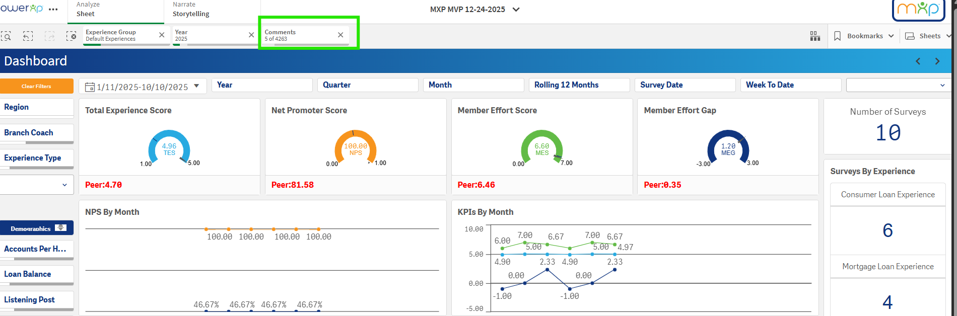 Clicking on the first group of results in the "Comments" Smart Search result, will filter on these comments specifically and apply on your PowerXP sheets. We can now see how these 5 comments scored, how many surveys these comments were tied to, who the members were that left these comments, essentially allowing you to slice and dice the data as you see fit!