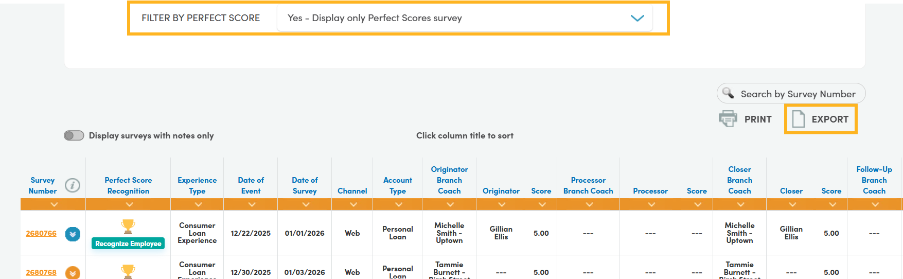 If you'd like to export a list of surveys with perfect scores, you can export the Surveys & Comments report as you normally would. Before exporting, confirm that Yes is selected for the Perfect Score filter so only qualifying surveys are included.