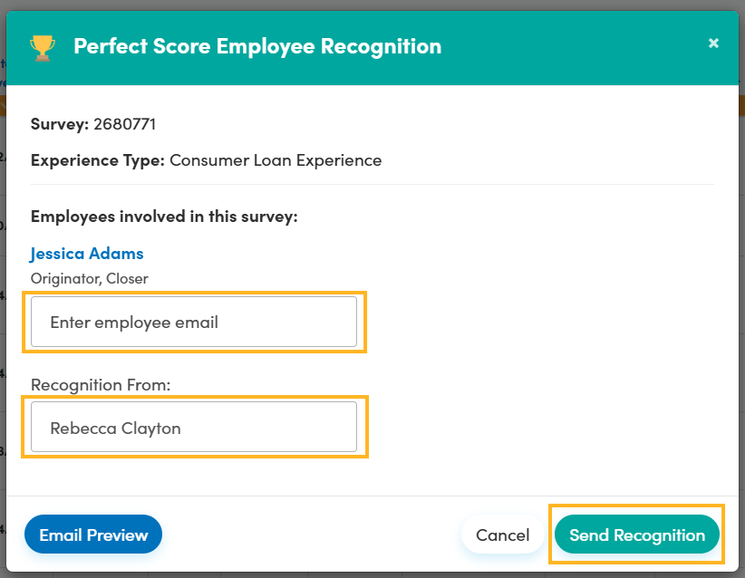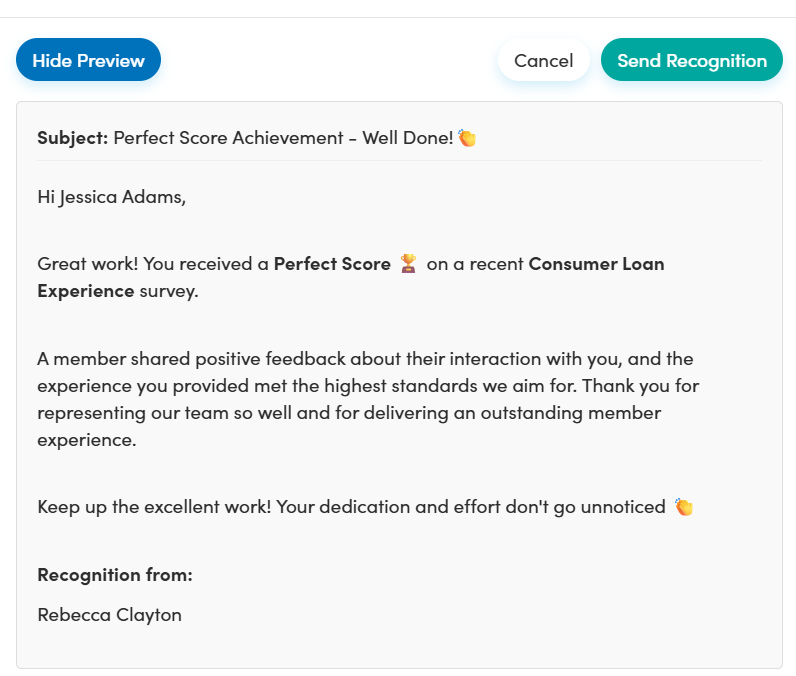 An email preview is available if you'd like to review the recognition message content before sending the message.