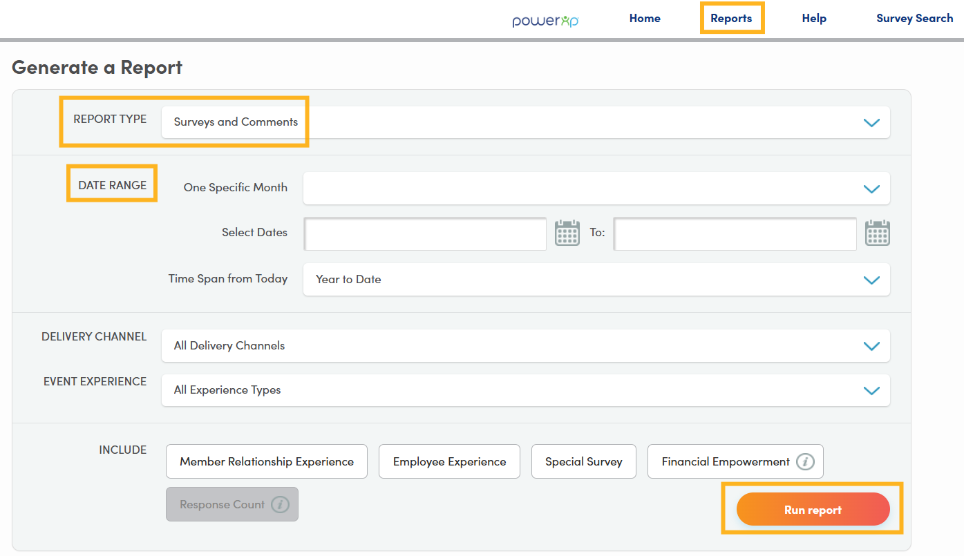 Within your MemberView portal, navigate to the Reports section to access the report generator. In the Report Type drop down, select Surveys and Comments, your desired date range, then click Run Report.